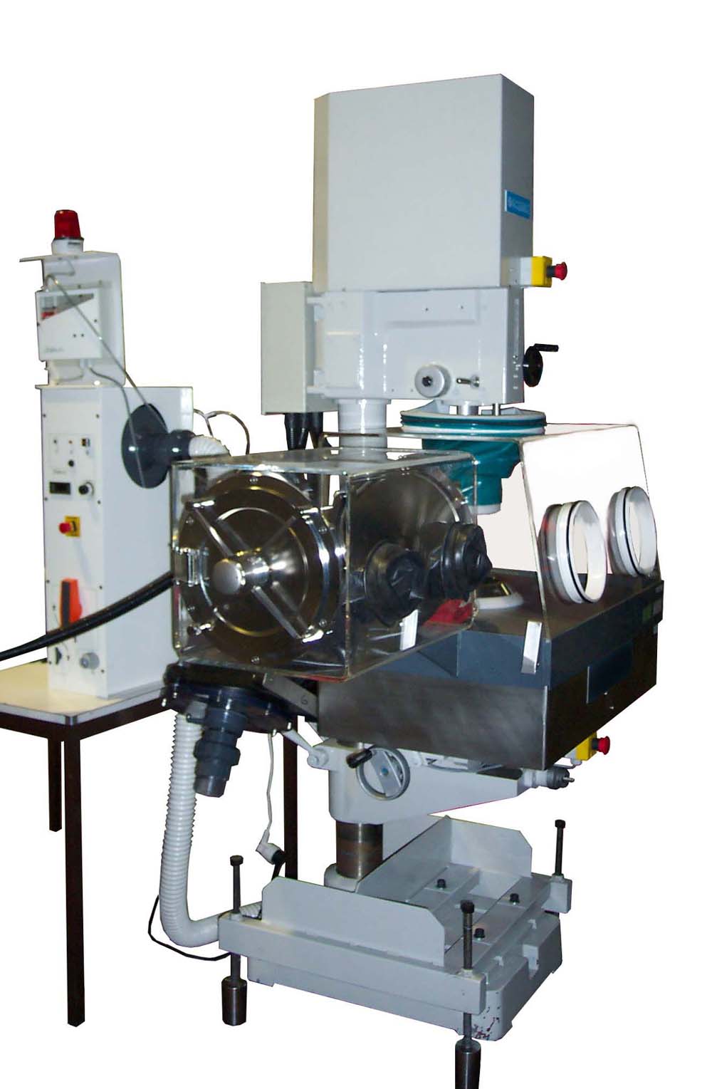 The mixing zone is located in an insulation box equipped with input and output compartments, 2 gloves and air dust filters for air in and air out .
